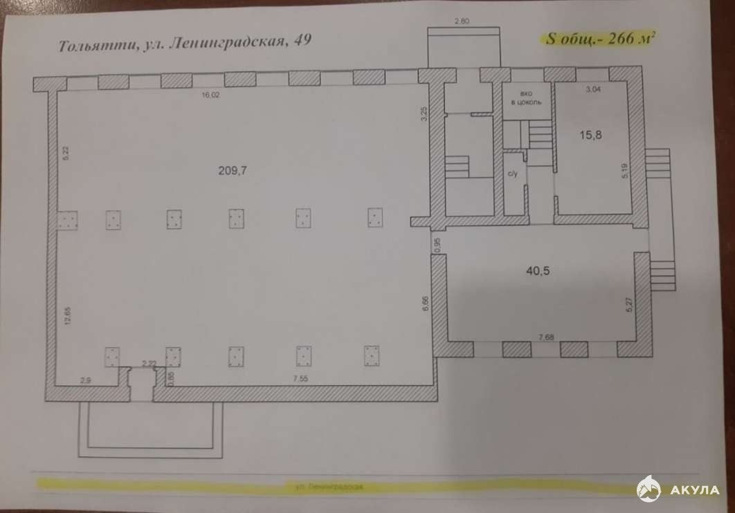 Общая площадь: 266 кв. м.(также есть подвал под всем помещением). Первый этаж 5-ти этажного жилого дома. Помещение нежилое. Над помещением располагается жилая квартира.
